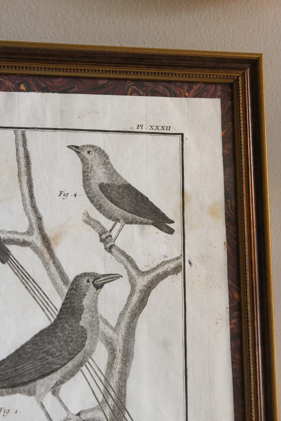 Sourced in Paris, this original 18th-century French engraving features a detailed natural history study of birds, rendered with fine linework and balanced composition. The engraving is mounted on antique marbled paper, adding subtle movement and depth beneath the illustration.