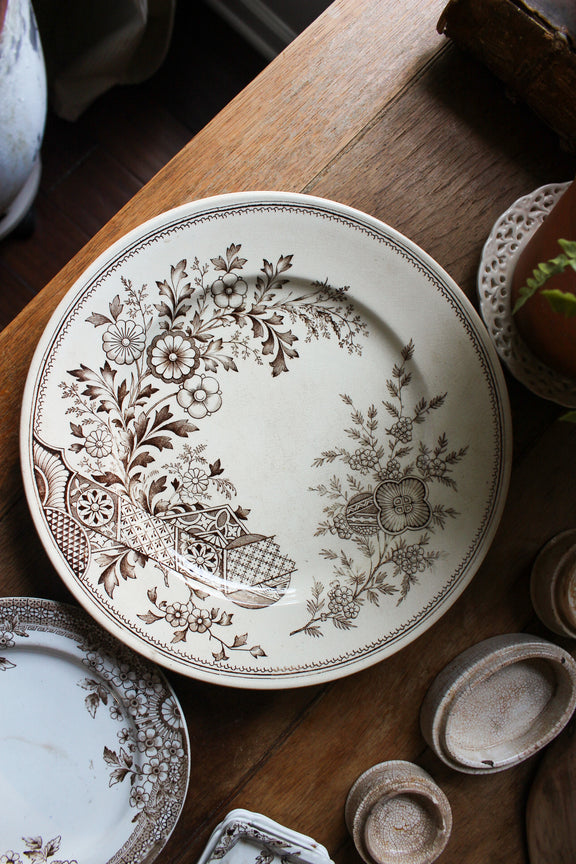 Enhance your home's collection with this exquisite brown transferware plate in the "Hampden" pattern, expertly designed by Christopher Dresser and skillfully produced by the renowned Old Hall Earthenware Co. Ltd. between 1861 and 1886. An elegant combination of form and function, this plate adds a touch of sophistication to any table setting.