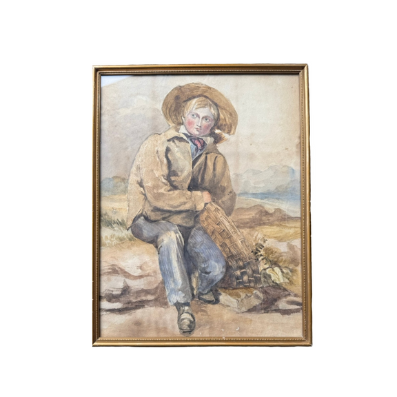 A charming 19th-century French watercolor depicting a young boy seated outdoors with a woven basket, dressed in rustic attire and a wide-brimmed straw hat. The soft, muted palette and delicate brushwork evoke a pastoral calm, with faint mountains in the background. Framed under glass in a simple gilt frame with light age wear.