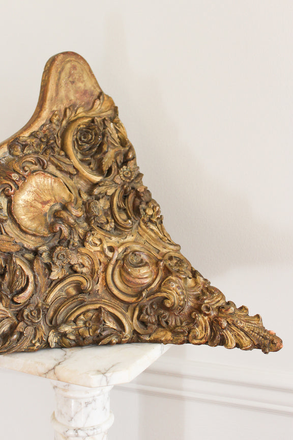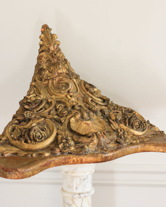 A beautifully ornate antique corner wall shelf featuring elaborate Rococo-style scrollwork and floral relief. Finished in warm aged gilt, the shelf is richly decorated with shell, floral, and scrolling motifs inspired by French Louis XV design.