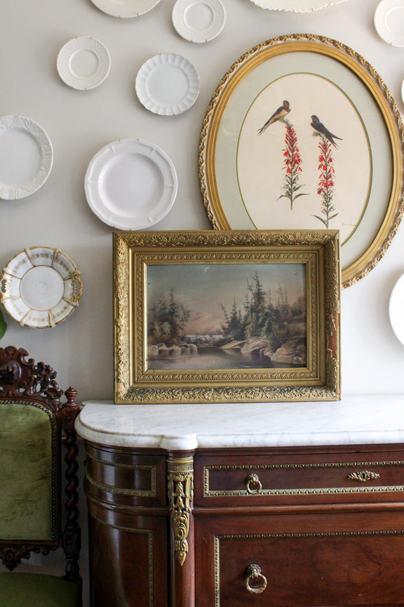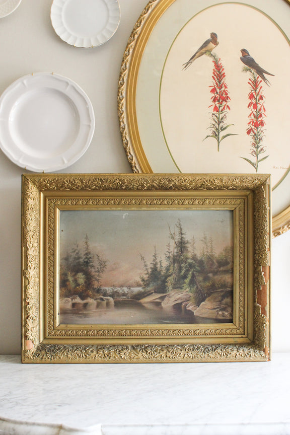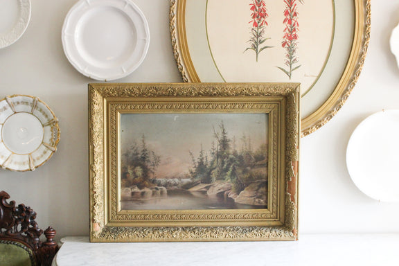 An original antique oil painting on board depicting a tranquil woodland landscape with water, rocks, and softly lit trees. The composition and muted palette give the piece a quiet, atmospheric quality that feels timeless and grounding.