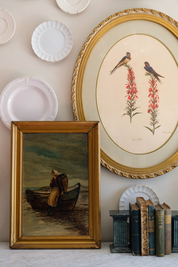 A beautifully atmospheric antique oil on board depicting a coastal woman resting beside her boat, basket slung over her shoulder and shoreline stretching quietly behind her. The muted palette of seafoam blues, sandy browns, and softened sky tones gives the piece a calm, contemplative presence.