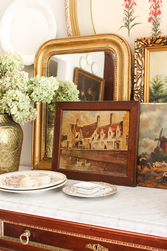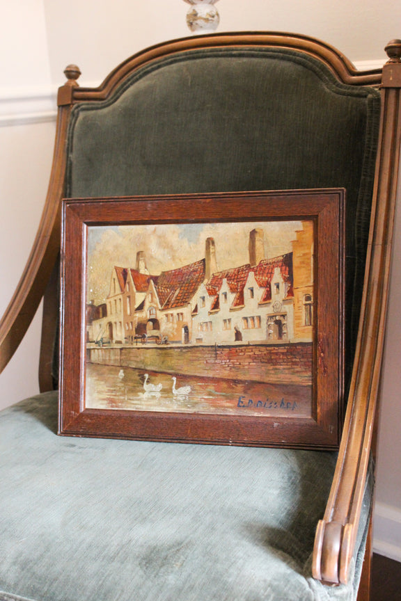 Expertly painted in rich oil colors, this antique Bruges, Belgium canal scene captures the beauty of the city's iconic swans. With stunning brush strokes and measuring at 14.5"x12.5", this painting would make a sophisticated addition to any art collection.