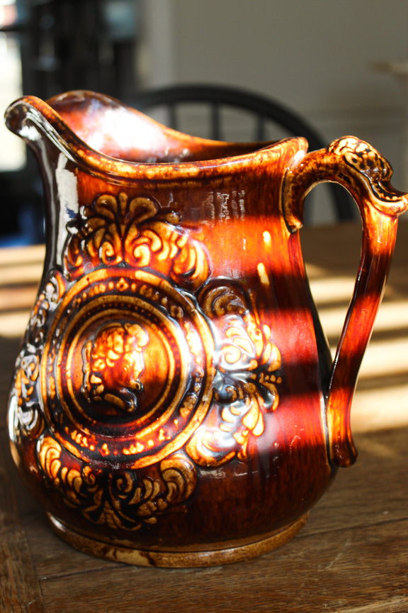 A handsome Victorian stoneware pitcher finished in a rich Rockingham brown glaze. The body features an ornate molded medallion with a classical profile portrait surrounded by scrolling decorative relief.